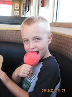 Carter got some really cool stuff! His friend Sam sent him his first Lego set and that is all he has been asking for! He got a few more sets to add to his collection as well as a marshmallow shooter, a new set of bases, a nerf rifle, transformers, a Zhu-Zhu pet, and Mario and Luigi and of course some green stuff for his wallet. Carter's request for supper was steak, green beans, potatoes, and bread all served on the special "red plate" We ended the night with family movie night with Karate Kid part 2 as the feature.