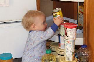 This is his favorite pastime! He LOVES playing in the lazy Susan or pantry and stacking things! He is getting really good at balancing the groceries! He did drop a can of soup on his toe a few weeks ago and ended up with a nasty black toenail!